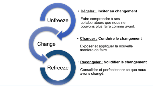 Développé dans les années 1940, le modèle de gestion du changement du chercheur en psychologie Kurt Lewin, comporte 3 étapes : le dégel (unfreeze), la transition ou le changement (change) puis le regel ou la recristallisation dans un nouvel état (refreeze). Pour symboliser le processus de renouvellement, Kurt Lewin utilise la métaphore du bloc de glace.