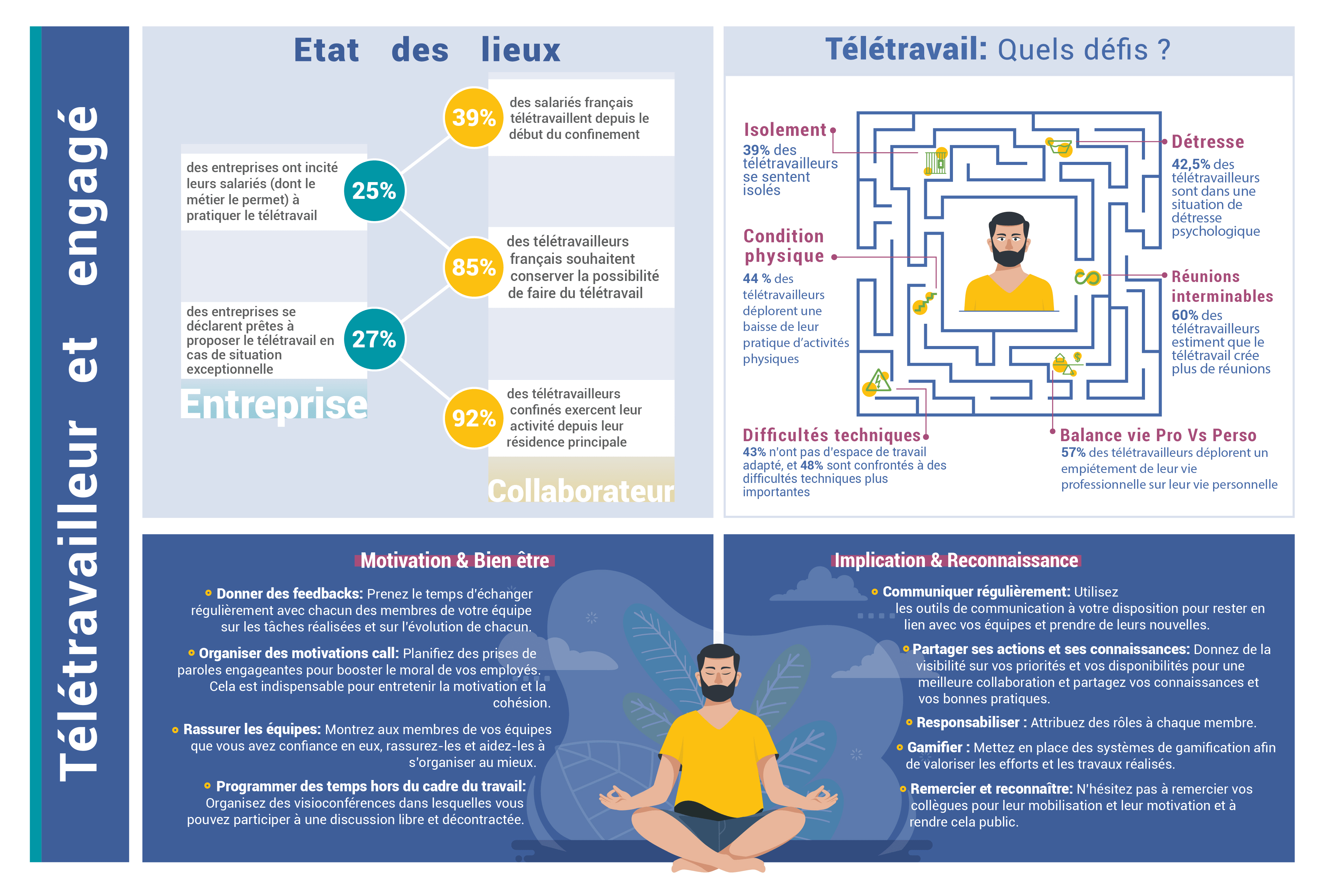 Les défis ne manquent pas et c’est ce qu’on traitera dans cette infographie. Comment les télétravailleurs ont vécu le confinement en cette période si particulière ? Quel est l’impact du télétravail sur le plan mental, physique et moral des télétravailleurs ? Comment réussir son expérience de ‘télétravailleur’ ? Et quel est le rôle du management dans le bien-être et la motivation des collaborateurs ?