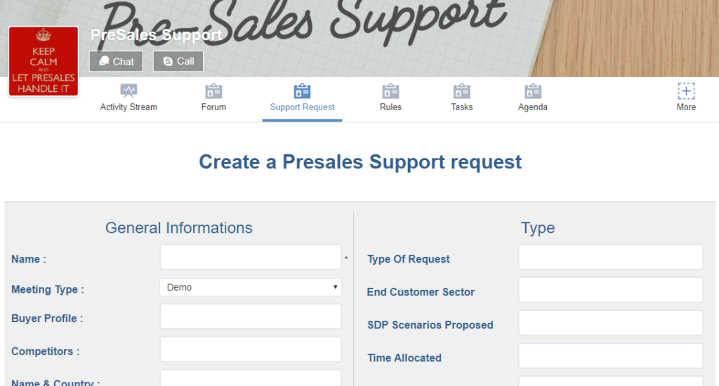 Internal support spaces: An example of this would be our “Pre-sales Support” space. Here, our sales team can request support from functional and technical consultants and experts from different teams (consulting, product video marketing, product management, etc.) when dealing with prospects who are interested in our software.