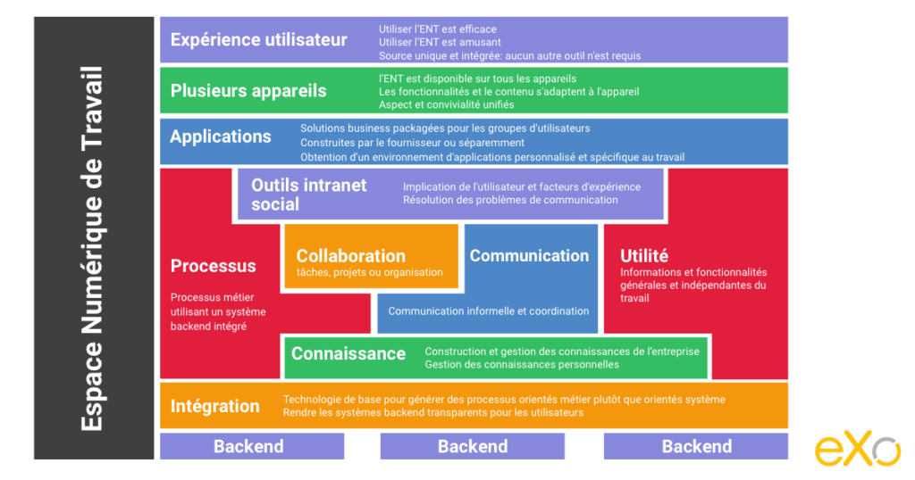 On peut définir un Espace Numérique de Travail comme un lieu de travail dématérialisé constitué d’un ensemble d’outils numériques inter-opérés permettant à un collaborateur de retrouver :